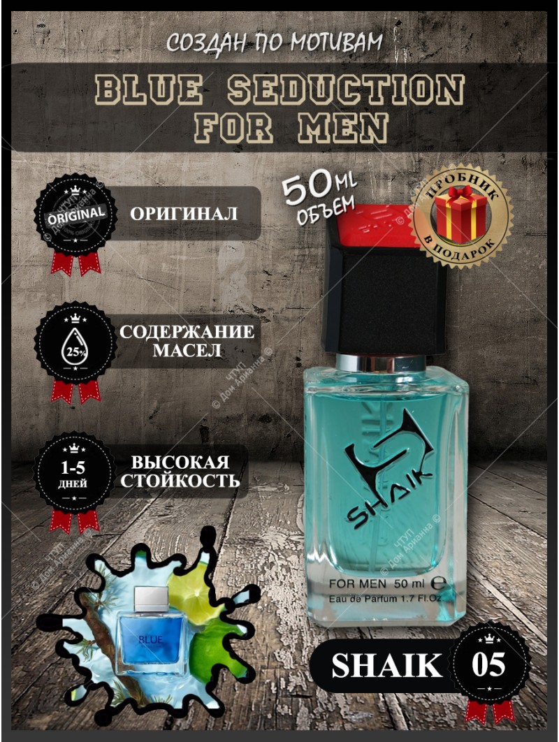 В поисках идеального мужского аромата, который сочетает в себе невероятную свежесть, динамичный характер и доступную цену? Парфюмерная вода Shaik 05, известная также как Blue Seduction, — это ваш выбор. Этот популярный аромат создан для современного, активного и уверенного в себе мужчины, ценящего в парфюмерии чистоту, энергию и притягательную силу. В нашем интернет-магазине парфюмерии вы можете купить эту туалетную воду в формате долговечных масляных духов, которые обеспечат стойкость и яркое звучание на весь день. Изучите каталог духов, чтобы заказать духи онлайн и найти идеальный подарок для мужчины, который предпочитает стиль без компромиссов.