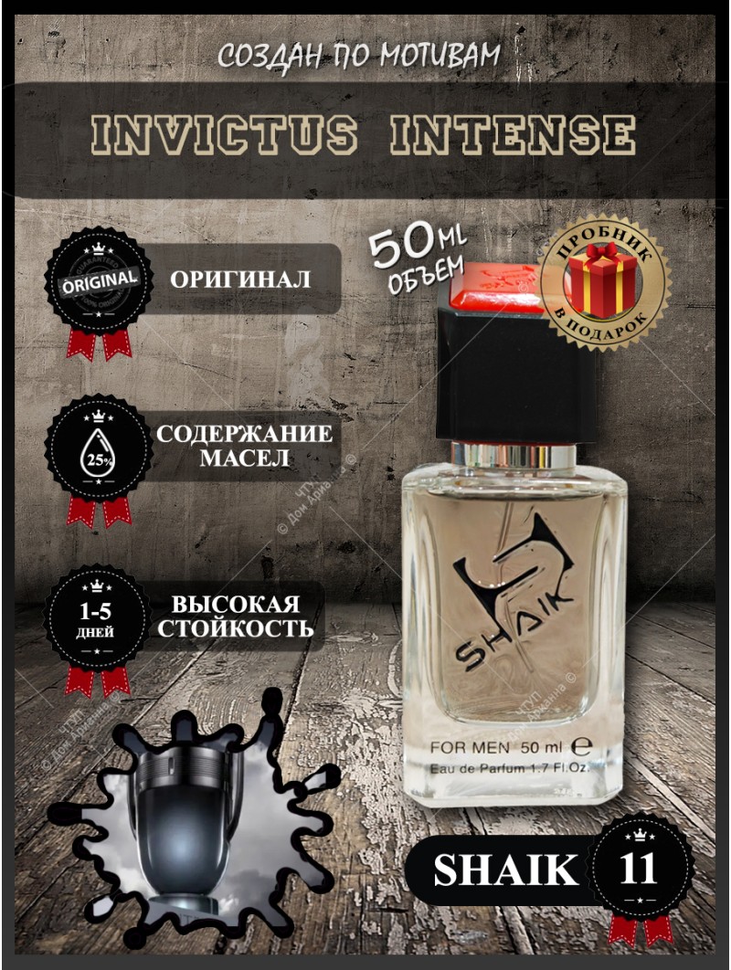 Парфюмерия Shaik обогащена эфирными маслами, благодаря чему имеют стойкость аромата до 48 часов. Верхние ноты: черный перец, апельсиновый цвет. Ноты сердца: лавр, виски. Базовые ноты: серая амбра, соль, амбра. Аромат, который одинаково хорошо подойдет как солидным взрослым мужчинам, так и стильным молодым людям. Яркий, насыщенный, харизматичный, он покоряет своим роскошным звучанием и делает любой образ привлекательным и запоминающимся. Начало композиции представлено аккордами душистого черного перца и нежного флердоранжа. Спустя пару минут в игру вступают сухие листочки лавра и обжигающий виски. Базовое трио из амбровых тонов и соли образует густой, плотный шлейф. Ароматы относятся к духам и обогащены эфирными маслами. Конкурентное окружение: Paco Rabanne Invictus Intense.