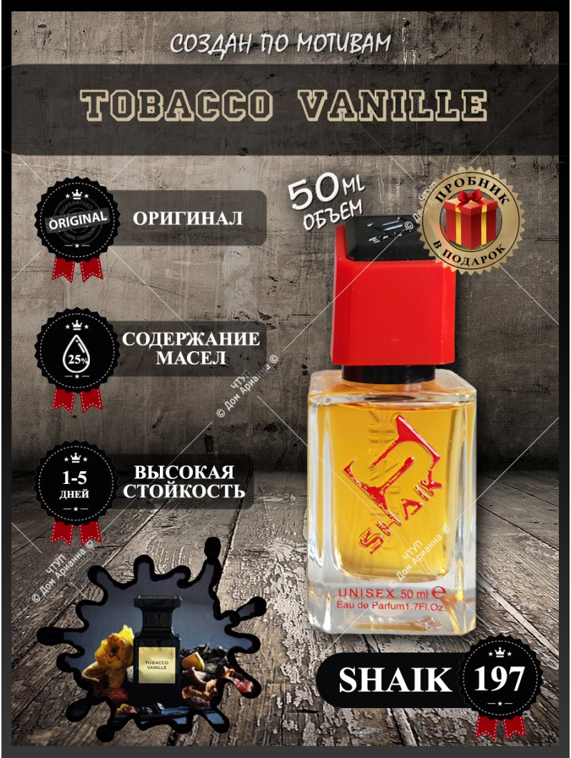 Парфюмерия Shaik обогащена эфирными маслами, благодаря чему имеют стойкость аромата до 48 часов. Уникальный дорогой аромат, который одинаково красиво смотрится как на дамах, так и на кавалерах. Однако, выглядит на женской и мужской коже Tom Ford Tobacco Vanille, все-таки, по-разному - на первых больше слышится шоколадно-ванильный коктейль, а на вторых особенно ясно звучат цветы и листья табака. Вообще, парфюм Tom Ford Tobacco Vanille - это какое-то немыслимое сочетание аристократизма и провокации, которое не оставляет равнодушными ни обладателей ароматной композиции, ни окружающих. С одной стороны, "Табачная ваниль" - является жемчужиной приватной коллекции Тома Форда и, казалось бы, должна подходить только для вечернего нанесения, но, с другой стороны, она безумно интересно выглядит днем, поэтому ее, чаще всего, используют, как повседневный аромат, что называется, "на любой случай". Тем более, что аромат Tom Ford Tobacco Vanille, несмотря на свою ярко выраженную породистость и дороговизну, подходит к поклонникам не слишком избирательно, даря восхитительную индивидуальность всем, кто захотел его приобрести. Пожалуй, Tom Ford Tobacco Vanille - это современная интерпретация традиций Старого Света. Словно бы, добрая старая Англия внезапно решилась на отчаянный и восхитительный вихрь вкуса прямо на Трафальгарской площади, элитарный мужской клуб, вдруг, распахнул свои двери для очаровательных дам, а Биг-Бен, отбивая час, начал исполнять легкий опереточный мотивчик. Ароматы относятся к духам и обогащены эфирными маслами.Конкурентное окружение Tom Ford Tobacco Vanille.