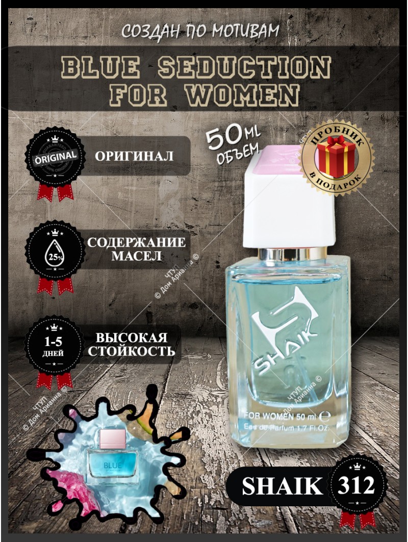 В поисках свежего, соблазнительного и невероятно стойкого парфюма? Обратите внимание на аромат Shaik 312 — туалетная вода, которая является точной интерпретацией популярной композиции Blue Seduction (Блю Седакшн). Этот парфюм создан для тех, кто ценит энергию моря и солнечную свежесть. Наш интернет-магазин предлагает купить этот востребованный аромат по привлекательной цене. В нашем каталоге духов вы найдете множество вариантов для любого настроения, а благодаря регулярным распродажам и духам со скидкой, вы можете сделать выгодную покупку. Заказать духи онлайн можно быстро и просто, что делает их отличным решением для подарка женщине или мужчине на любой праздник.