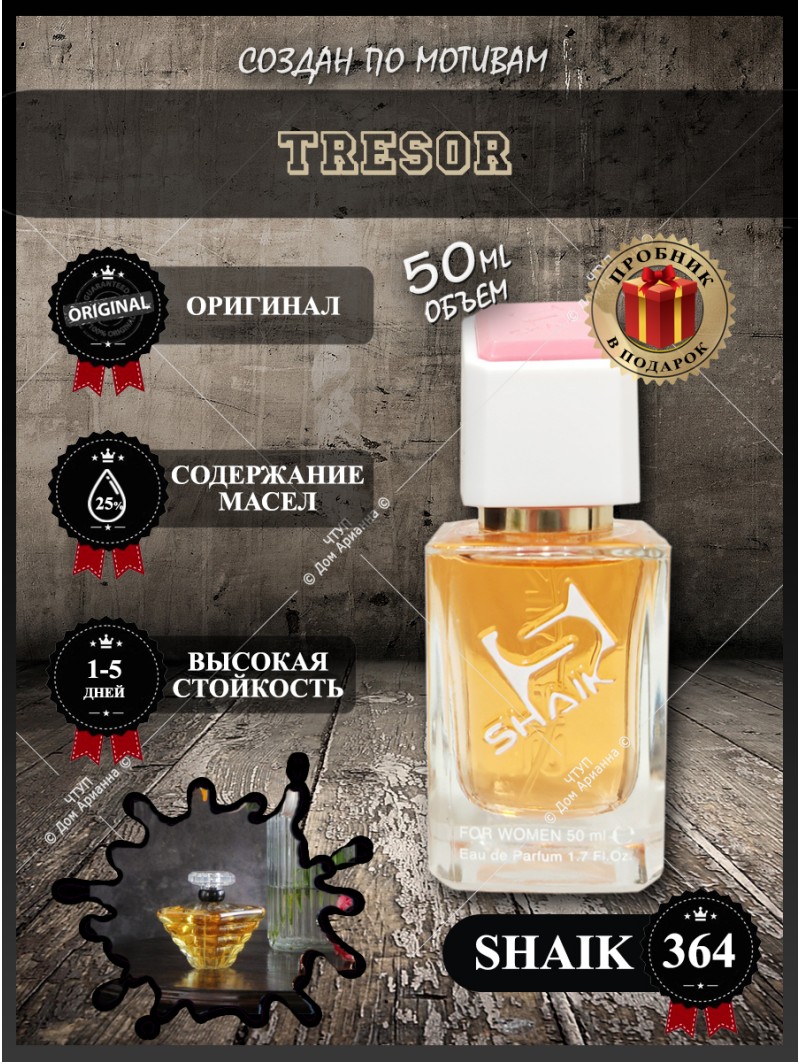 Ищете аромат, который говорит о страсти, тайне и соблазне? Парфюм Шейк 364 – это туалетная вода, вдохновленная композицией La Nuit Trésor, созданная для женщин, не боящихся быть в центре внимания. Этот аромат – настоящая жемчужина в мире парфюмерии, воплощение романтики и чувственности. Наш интернет-магазин предлагает купить этот популярный женский парфюм по привлекательной цене. В каталоге духов вы найдете лучшие ароматы для особых моментов, а благодаря регулярным распродажам и духам со скидкой ваша покупка станет еще приятнее. Заказать духи онлайн можно быстро и легко, что делает их прекрасным решением для подарка женщине на день рождения, Новый год или другой праздник.