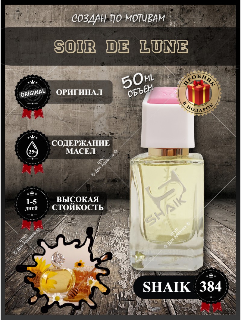 Позвольте себе роскошь вечной и интеллигентной классики. Закажите духи Shaik 384 Soir De Lune в нашем магазине уже сегодня и обретите свой таинственный, невероятно стойкий лунный шлейф. Это больше, чем парфюмерия — это вложение в свой безупречный стиль и источник восхищенных комплиментов.