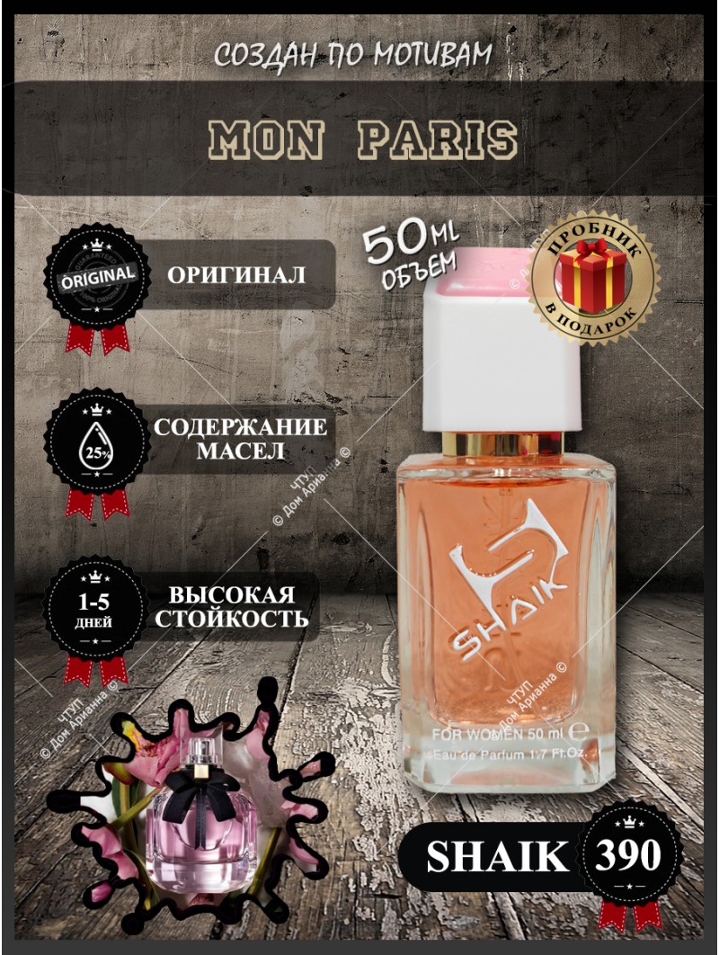 Ищете аромат, который воплощает безудержную радость влюбленности и энергию праздника? Туалетная вода Shaik 390 — это точная интерпретация культового парфюма Mon Paris, созданная для женщин, которые не боятся чувств и живут на полную. Этот парфюм — взрыв эмоций, застывший во флаконе, настоящий гимн любви и яркой жизни. В нашем интернет-магазине вы можете купить эту страстную масляную парфюмерию, которая покоряет своей стойкостью и точной передачей оригинала. Изучите наш каталог духов, чтобы заказать духи онлайн по специальной цене — мы предлагаем популярные ароматы со скидкой во время распродаж, что делает покупку идеальным подарком женщине на день рождения, годовщину или любой романтический праздник.